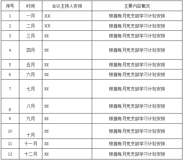 二、学习要求 1、时间安排:每月定于月末,星期五下午3:00-5:00开会。 2、会议通知:开会前2天在工作群通知广大党员并号召全体职工群众参加,望参会人员提前安排好工作事宜,按时参加。 3、会议内容:每次会议需要会议主持人员提前做好学习内容的PPT,除必须学习科目外,还需根据上级党组织、协会和支部安排增加相关内容。 4、党员笔记要求:要求全体党员同志抄写每月党建知识或学习笔记一篇(或心得体会),发到党建群里,下期会议总结完成党建笔记的情况。 5、请假制度:会议请假人员,需经党支部书记签批请假条,否则视为缺席党组织生活会议,请假人员需及时补齐党员笔记和会议内容。 6、宣传报道:会议主持人在会议后3天内准备微信平台文档,由行政部统一传到平台。 三、其他安排事项。 |